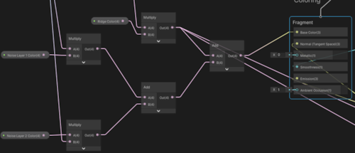 Dazu packen wir lediglich den Output jedes einzelnen Noise-Musters in eine "Multiply"-Funktion. Diese multipliziert zwei Eingaben miteinander. Die zweite Eingabe ist dann die jeweilige Farbe für das Noise-Muster.