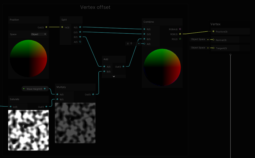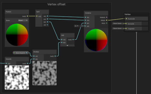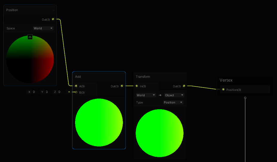 Mit Shadergraph geht das ganz leicht, indem wir zur aktuellen Position der Vertices einfach etwas hinzufügen und diesen Wert dann für das Objekt umwandeln.