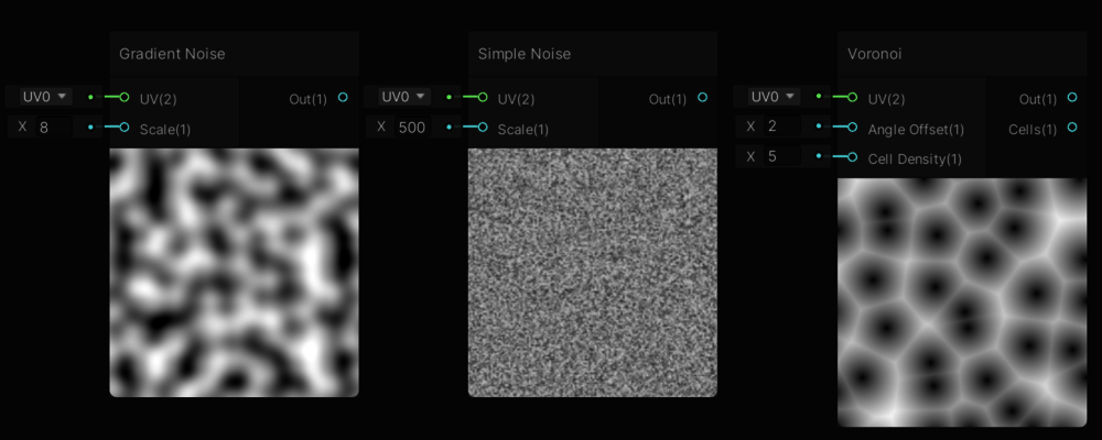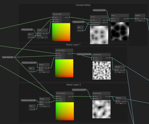 Zwei Gradient-Noise-Muster mit verschiedenen Größen und ein Vornoi-Noise-Muster, das später die weißen Kanten von bspw. brechenden Wellen darstellt.